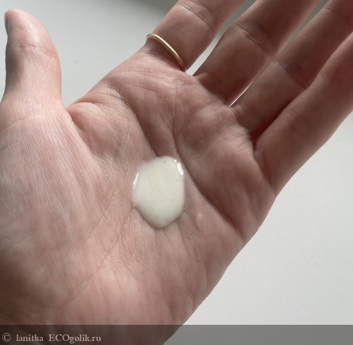 Цвет у крема молочно-белый, однородный, чуть прозрачный, при распределении кажется разбеленным.