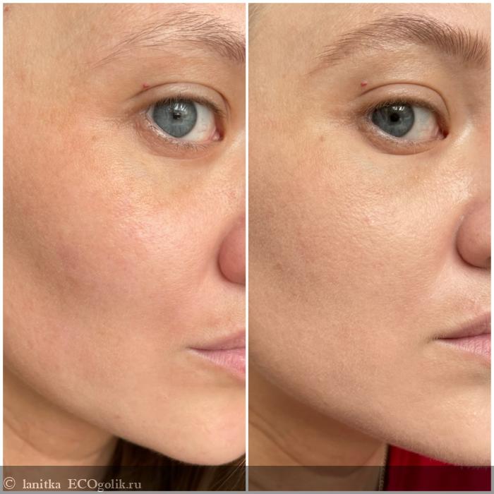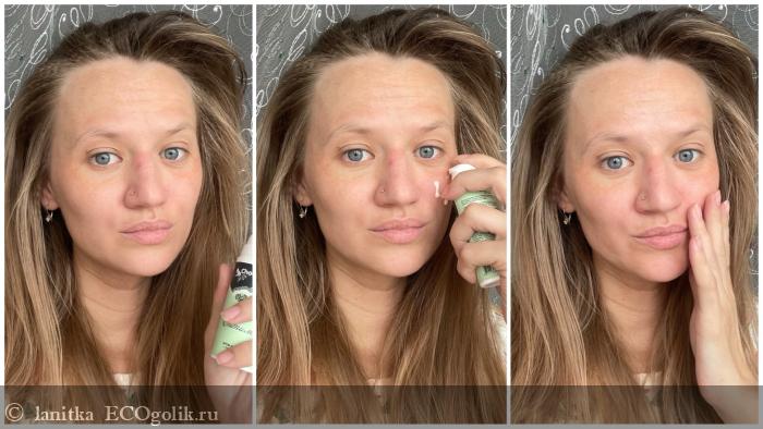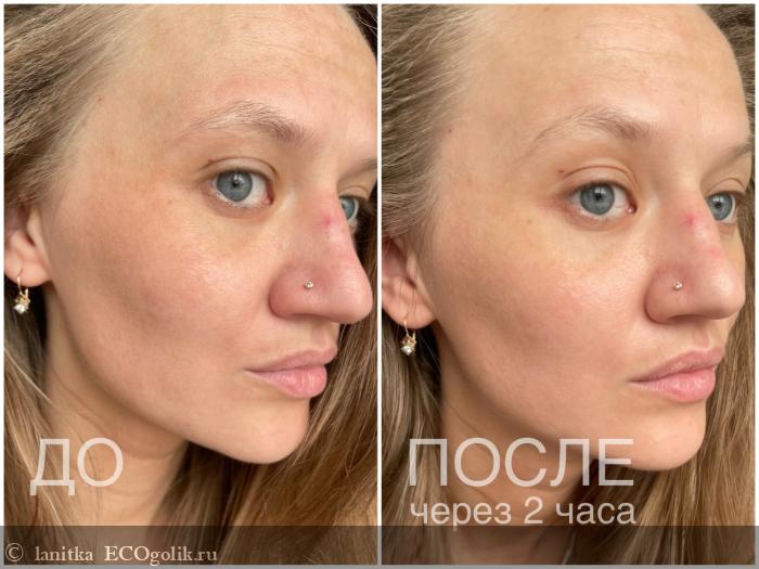 Во время нанесения ощущается на лице как что-то влажное, даже мокрое, но при распределении практически сразу исчезает на коже. Очень невесомое покрытие без глянцевого финиша. Как и заявлено есть матирующий эффект, но не глухой, как у пудры.
