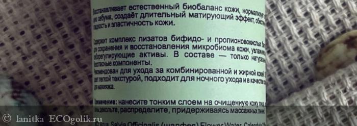 Фитокомпозиция из гидролатов шалфея, календулы и розмарина, натурального масла виноградной косточки, усиленная купажом СК-СО2 экстрактов (зверобоя, липы, ромашки и календулы), обладает отличным антибактериальным действием, регулирует выделение себума, очищает поры, способствует регенерации клеток кожи, выравнивает цвет лица, уменьшает воспаление и раздражение.