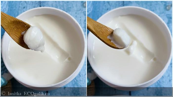При наборе из банки конционер четко сохраняет свою форму, как в банке, так и на ложке, которой я набирала.