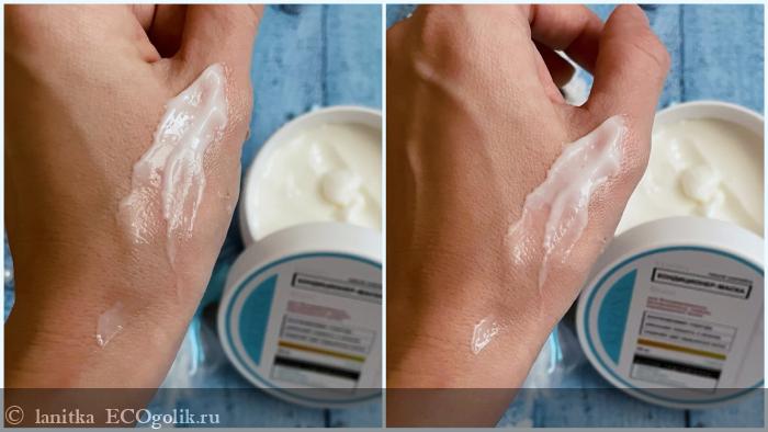 Консистенция кондиционера-маски густая, но не липка, не вязкая, больше всего мне напоминает мягкое сливочное масло.