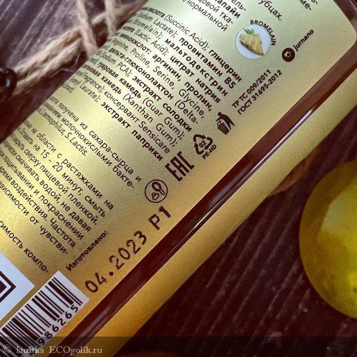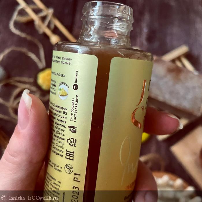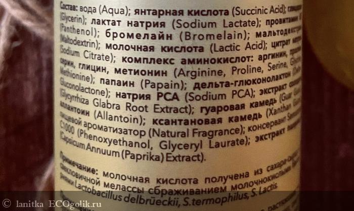 Состав: вода (Aqua); янтарная кислота (Succinic Acid); глицерин (Glycerin); лактат натрия (Sodium Lactate); провитамин B5 (Panthenol); бромелайн (Bromelain); мальтодекстрин (Maltodextrin); молочная кислота (Lactic Acid); цитрат натрия (Sodium Citrate); комплекс аминокислот; аргинин, пролин, серин, глицин, метионин (Arginine, Proline, Serine, Glycine, Methionine); папаин (Papain); дельта-глюконолактон (Delta-Gluconolactone); натрия PCA (Sodium PCA); экстракт солодки (Glycyrrhiza Glabra Root Extract); rуаровая камедь (Guar Gum); аллантоин (Allantoin); ксантановая камедь (Xanthan Gum); пищевой ароматизатор (Natural Fragrance); консервант Sensicare C1000 (Phenoxyethanol, Glyceryl Laurate); экстракт паприки (Capsicum Annuum (Paprika) Extract).