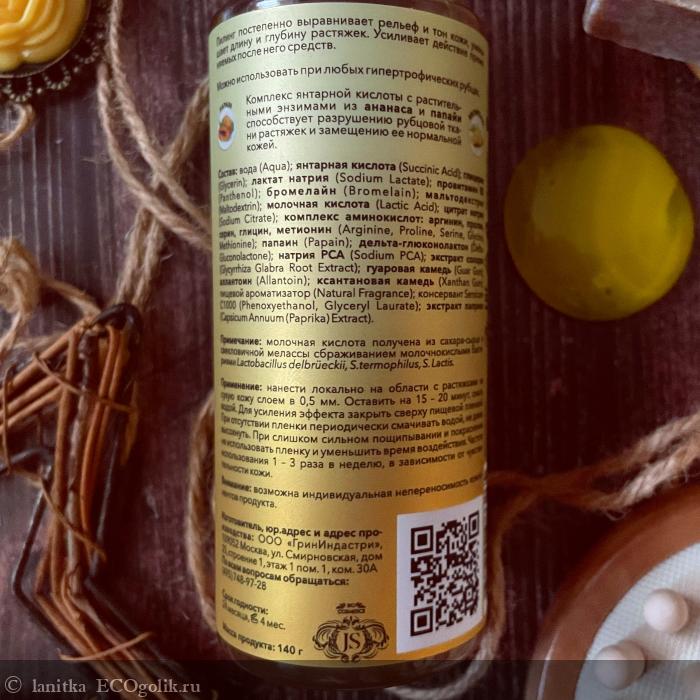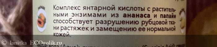 Комплекс янтарной кислоты с растительными энзимами из ананасаи папайи способствует разрушению рубцовой ткани растяжек и замещению ее нормальной кожей.