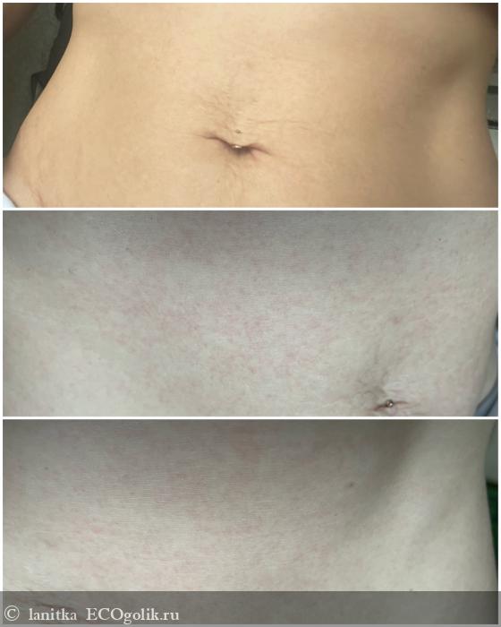 Так как я и изначально не расчитывала на то, что растяжки исчезнут, да и производитель не обещает их полное исчезновение, а только уменьшение длины и глубины, выравнивание тона и рельефа. То с этим всем я полностью согласна! То, что удалось растянутую как тряпочку кожу подтянуть в кучку, уплотнить и визуально немного улучшить - уже большущее достижение.
