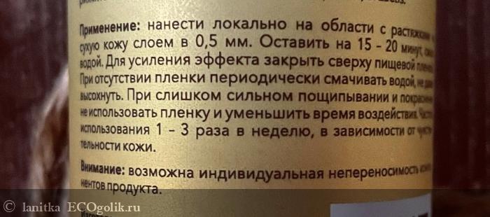 Способ применения: нанести локально на области с растяжками на сухую кожу слоем в 0,5 мм. Оставить на 15 – 20 минут, смыть водой. Для усиления эффекта закрыть сверху пищевой пленкой. При отсутствии пленки периодически смачивать водой, не давая пилингу высохнуть. При слишком сильном пощипывании и покраснении не использовать пленку и уменьшить время воздействия. Частота использования 1 – 3 раза в неделю, в зависимости от чувствительности кожи.