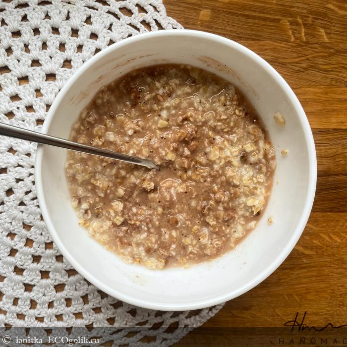 Каша больше не пыльно-пустая по вкусу, она сладковатая как будто с орехом и шоколадом. Это не яркие выраженные вкусы, а «угадываемые», но очень приятно сочетающиеся с овсянкой и придающие ей дополнительный вкусовой оттенок и, конечно, пользу.