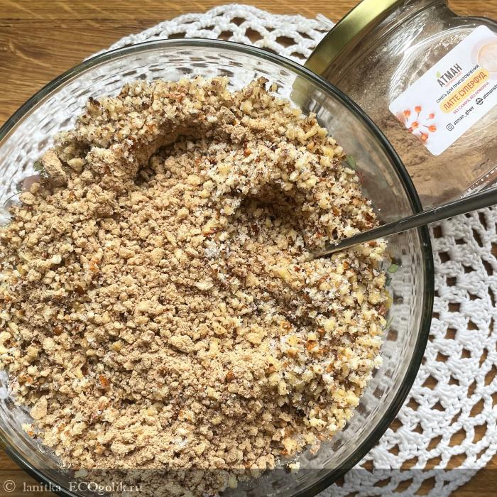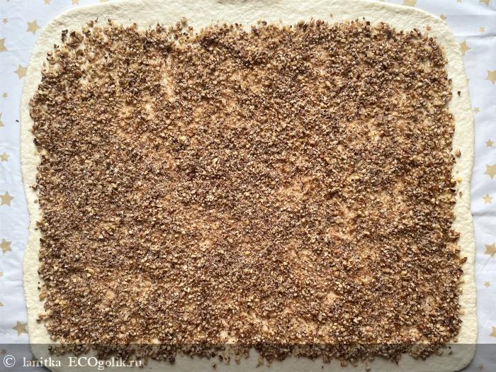 - Равномерно распределить по тесту ореховую начинку, отступая от внешнего края несколько сантиметров.