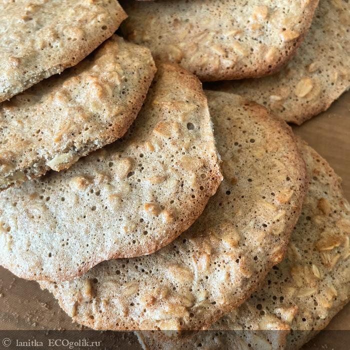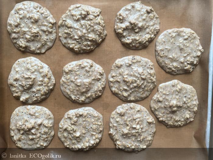 Тесто довольно текучее, поэтому я выкладывала горкой, потом оно само растекалось по поверхности, я лишь чуть контролировала процесс, чтобы форма была более круглая. Между печеньками лучше отступать побольше места, чтобы они не сливались. У меня получилось 11 штучек, довольно крупных.