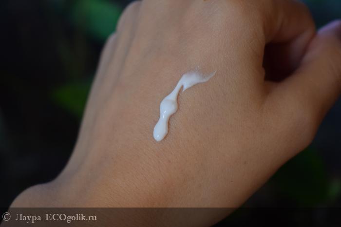 Сама консистенция крема белого цвета. Текстура плотная, напомнила больше крем с SPF защитой. Но в тоже время не такая тяжёлая, она лёгкая и бархатистая.