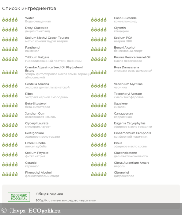 Вода очищенная, коко-глюкозид1, децил глюкозид1, глицерин (растительный), метил кокоил таурат натрия, натрий ПКК1, пантенол, бензиловый спирт1, гидролизованный протеин пшеницы, масло персиковой косточки, эфиры фитостеролов масла семян горчицы абиссинской, экстракт розы дамасской, экстракт центеллы азиатской, экстракт черники, экстракт черной смородины, смесь токоферолов1, бета-ситостерол1, сквален1 (растительный), ксантановая камедь, каррагинан, глицерил лаурат1, эфирное масло гвоздики, эфирное масло герани, эфирное масло листьев коричника камфорного (дерева хо), эфирное масло плодов литсеи кубеба, эфирное масло сосны, фитат натрия1, дельта-глюконолактон, гераниол2, нерол2, фенилэтиловый спирт2, цитронеллол2.