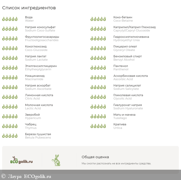 Aqua, Coco-Betaine, Sodium Coco-Sulfate, Caprylyl/Capryl Glucoside*, Fructooligosaccharides, Hydroxyethyl Urea, Coco-Glucoside (and) Glyceryl Oleate*, Sodium Lactate, Benzyl Alcohol (and) Ethylhexylglycerin, Gardenia Jasminoides Oil (эфирное масло гардении), Panthenol (and) Niacinamide (and) Ascorbic Acid (and) Sodium Ascorbate (and) Sodium Salicylate (and) Citric Acid (and) Glycolic Acid (and) Lactic Acid (and) Sodium Hyaluronate, Hypericum Perforatum (зверобоя) Extract, Tussilago Farfara (мать-и-мачехи) Extract, Thymus Serpyllum (чабреца) Extract, Urtica Dioica (крапивы) Extract, Betula Pubescens (берёзовых почек) Extract, Tocopheryl Acetate (витамин Е).