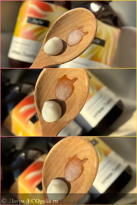 Шампунь имеет гелевую текстуру с легким мерцанием, бальзам более плотный, он кремовый и держит форму до победного.