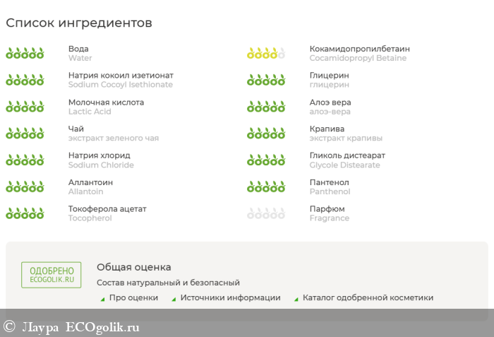 Aqua/Water (вода); Cocamidopropyl Betaine (мягкое ПАВ на растительной основе); Sodium Cocoyl Isethionate (мягкое ПАВ на растительной основе); glycerin (глицерин); Lactic Acid (Молочная кислота); Aloe Barbadensis Leaf Gel (Гель алоэ-вера); Melaleuca Alternifolia (Tea Tree) Leaf Extract (экстракт зеленого чая); Urtica Dioica Extract (экстракт крапивы); Sodium Chloride (загуститель); Glycole Distearate (смягчающее средство); Allantoin (аллантоин); Panthenol (Пантенол); Tocopherol (витамин Е); Fragrance (ароматизатор)