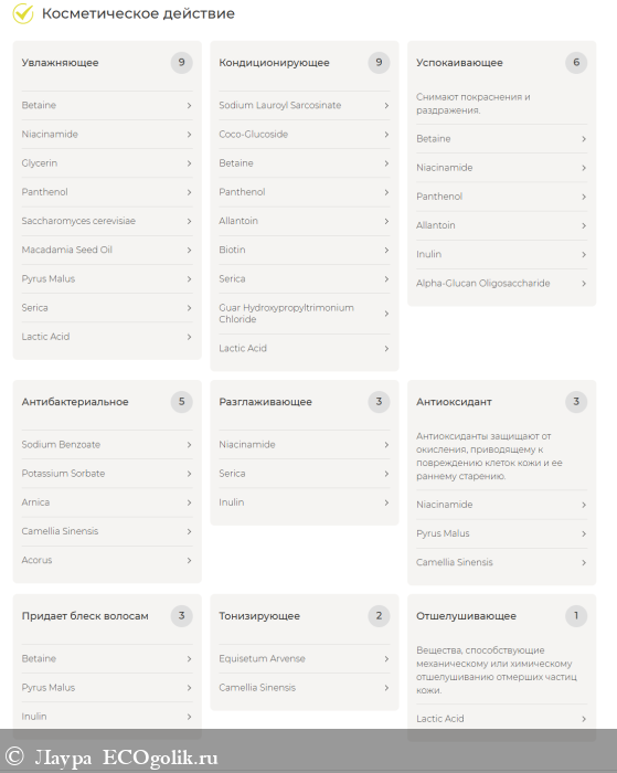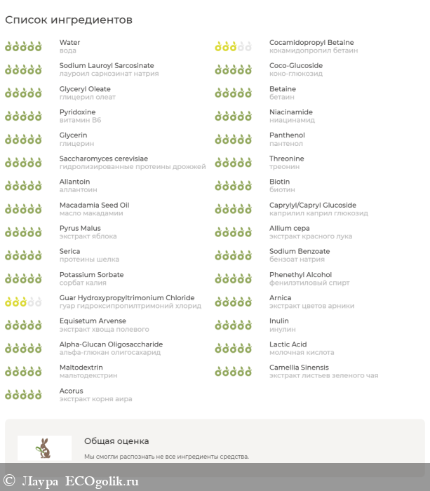 Вода, кокамидопропил бетаин **, лауроил саркозинат натрия*, коко-глюкозид**, коко-глюкозид, глицерил-олеат **, бетаин**, глицерин**, витамин В6, ниацинамид, глицерин, пантенол, гидролизированные протеины дрожжей, треонин, аллантоин, биотин*, водорастворимое масло макадамии**, каприлил каприл глюкозид**, экстракт яблока*, экстракт красного лука**, гидролизат протеинов шёлка*, бензоат натрия**, сорбат калия**, фенилэтиловый спирт*, гуар гидроксипропилтримоний хлорид**, экстракт цветов арники* , экстракт хвоща полевого*, инулин, альфа-глюкан олигосахарид**, молочная кислота**, парфюм из эфирных масел***, мальтодекстрин**, экстракт листьев зеленого чая**, экстракт корня аира*.