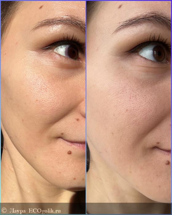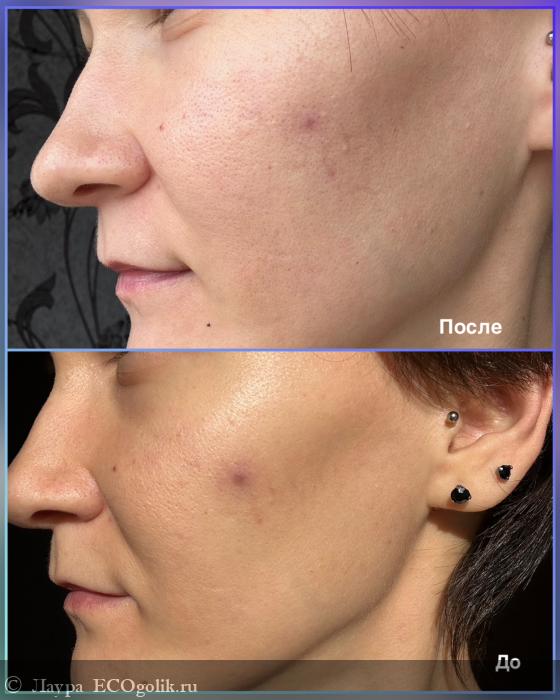 Ожидание - реальность в случае с этим кремом вполне сошлись. В принципе мои до/после не такие показательные (конечно, я этому рада с одной стороны). Могу только попытаться объяснить на пальцах, чем понравился крем. Есть только одна фотка, где видно работу крема, это больное воспаление на щеке, которое прошло за неделю. Да, остаточное еще осталось, однако, движется к завершению. Ничего кроме крема я не мазала, у меня нет точечных специальных средств и другой - ночной не обещал мне помощь с воспалениями, поэтому все лавры крему №1.