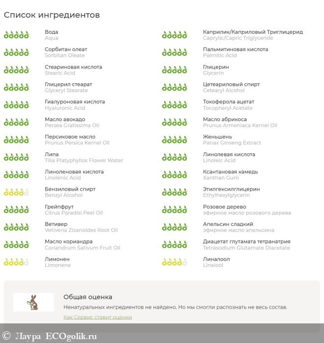 Aqua (вода очищенная), Caprylic/Capric Triglyceride (каприлик/каприк триглицериды)** , Polyglyceryl-3 Distearate , Polyglyceryl-6 Tristearate, Sorbitan Oleate , Palmitic Acid, Stearic Acid (натуральный эмульгатор)*, Glycerin (глицерин)**, Glyceryl Stearate (глицерил стеарат)**, Cetearyl Alcohol (цетеариловый спирт)**, Hyaluronic Acid (низкомолекулярная гиалуроновая кислота) ***, Tocopheryl Acetate (витамин Е) , Persea Gratissima Oil (масло авокадо), Prunus Armeniaca Kernel Oil (масло абрикосовой косточки), Prunus Persica Kernel Oil (масло персиковой косточки), Panax Ginseng Extract (экстракт женьшеня), Tilia Platyphyllos Flower Water (цветочная вода липы), Linoleic Acid, Linolenic Acid (витамин F), Xanthan Gum (ксантановая камедь) , Benzyl Alcohol (бензиловый спирт)* , Ethylhexylglycerin (этилгексилглицерин)*, Citrus Paradisi Peel Oil (эфирное масло грейпфрута), Aniba Rosaedora Wood Oil (эфирное масло розового дерева), Vetiveria Zizanoides Root Oil (эфирное масло ветивера), Сitrus Sinensis Peel Oil (эфирное масло апельсина), Coriandrum Sativum Fruit Oil (эфирное масло кориандра), Tetrasodium Glutamate Diacetate (диацетат глутамат тетранатрия)** , Limonene****, Linalool****