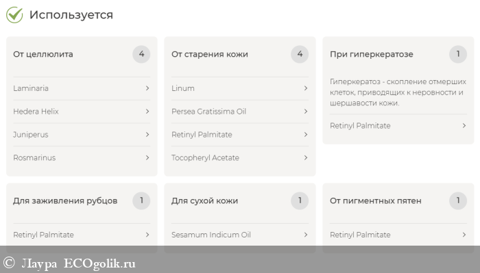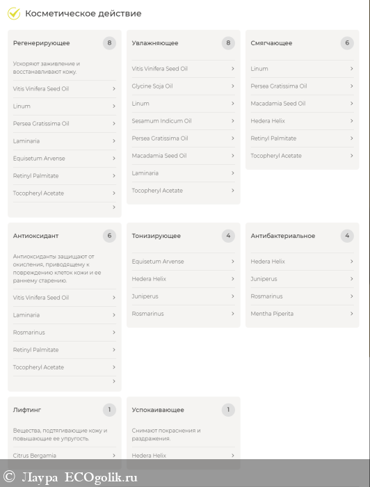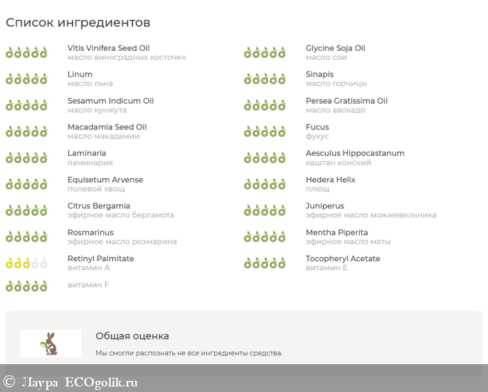 Масла (виноградных косточек, сои, льна, горчицы, кунжутных семян, авокадо, макадамии), СО2 экстракты (кофе зеленого, фукуса, ламинарии, каштана конского, полевого хвоща, плюща), эфирные масла (бергамота, можжевельник, розмарина, мяты), витамины А, Е, F