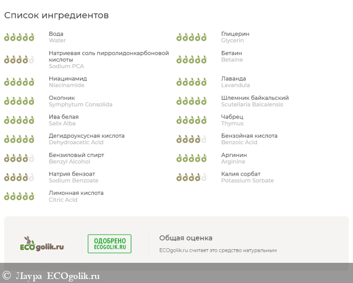 Гидролат лаванды, вода очищенная, глицерин (растительный), натрий ПКК1, бетаин1 (натуральный), ниацинамид (витамин В3), экстракт лаванды, экстракт окопника, экстракт шлемника байкальского, экстракт коры ивы, экстракт чабреца, дегидроуксусная кислота, бензойная кислота, бензиловый спирт, аргинин1, бензоат натрия, сорбат калия, лимонная кислота.
