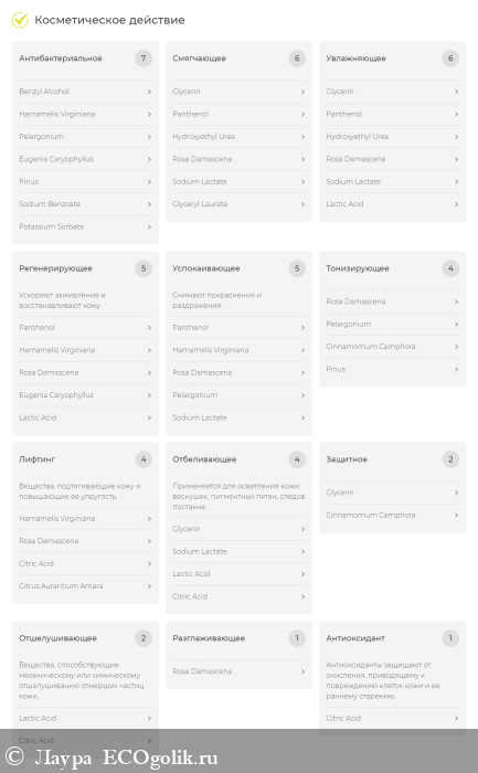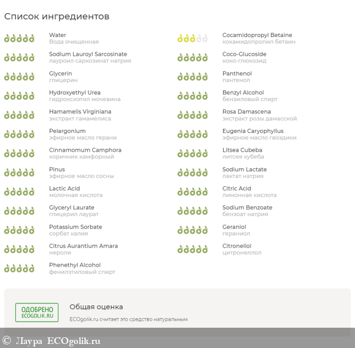 Вода очищенная, кокамидопропил бетаин, лауроил саркозинат натрия, коко-глюкозид1, глицерин (растительный), пантенол, гидроксиэтил мочевина, бензиловый спирт1, экстракт гамамелиса, экстракт розы дамасской, эфирное масло герани, эфирное масло гвоздики, эфирное масло листьев коричника камфорного (дерева хо), эфирное масло плодов литсеи кубеба, эфирное масло сосны, лактат натрия, молочная кислота, лимонная кислота, глицерил лаурат1, бензоат натрия, сорбат калия, гераниол2, нерол2, цитронеллол2, фенилэтиловый спирт2.