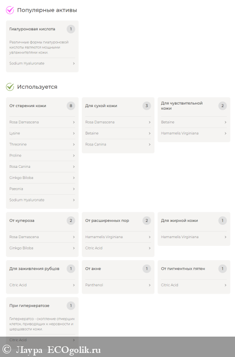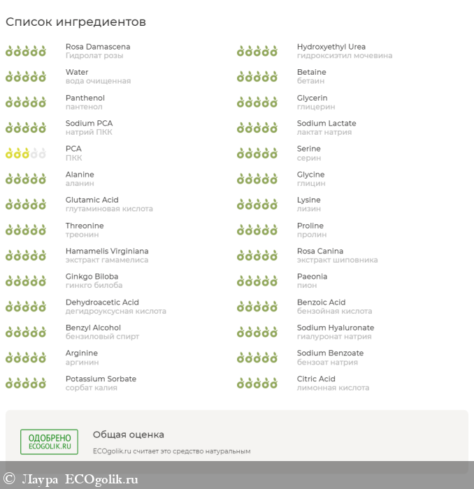 Гидролат розы галльской, гидроксиэтил мочевина, вода очищенная, бетаин1 (натуральный), пантенол, глицерин (растительный), натрий ПКК, лактат натрия, ПКК, серин, аланин, глицин, глутаминовая кислота, лизин, треонин, пролин, экстракт гамамелиса, экстракт шиповника, экстракт гинко билоба, экстракт пиона, дегидроуксусная кислота, бензойная кислота, бензиловый спирт, гиалуронат натрия1, аргинин1, бензоат натрия, сорбат калия, лимонная кислота.