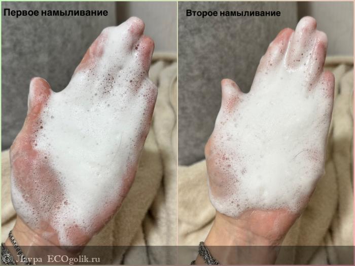 Я всегда мою голову в два намыливания, с муссом картина не поменялась. Пенится мусс шикарно, даже с первого раза. Мыльная основа тоже есть и можно массировать кожу хоть все полчаса (если вам надо). Ощущение чистоты сохраняется на протяжении всего дня, моим волосам нравятся муссы, как и мне.