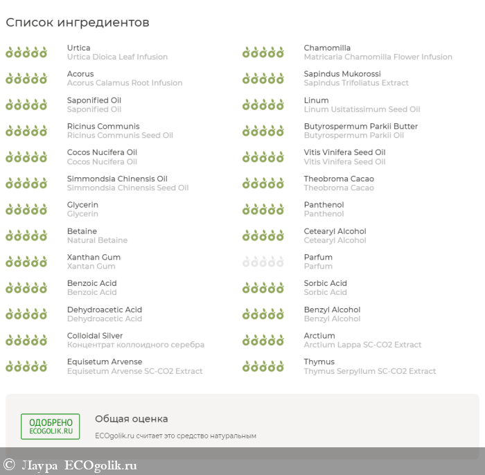 Equisetum Arvense Leaf (хвоща полевого) Infusion, Urtica Dioica Leaf (крапивы) Infusion, Matricaria Chamomilla Flower (ромашки) Infusion, Acorus Calamus Root (корня аира) Infusion, Arctium Lappa Root (корня лопуха) Infusion, Linum Usitatissimum Seed (семян льна) Infusion, Sapindus Trifoliatus (мыльного ореха) Extract , Saponified (Coconut) Oil, Saponified (Olive) Oil, Linum Usitatissimum Seed (семян льна) Oil, Arctium Lappa Root (репейное) Oil, Ricinus Communis (Castor) Seed (касторовое) Oil, Butyrospermum Parkii (Shea Butter) (масло ши) Oil, Cocos Nucifera (Coconut) (кокоса) Oil, Vitis Vinifera Seed (виноградной косточки) Oil, Simmondsia Chinensis (Jojoba) Seed (жожоба) Oil, Theobroma Cacao (Powder), Glycerin, Panthenol, Natural Betaine, Cetearyl Alcohol, Xantan Gum (ксантановая камедь), Parfum, Benzoic Acid, Sorbic Acid, Dehydroacetic Acid, Benzyl Alcohol, Colloidal Silver Concentrate, Arctium Lappa (корня лопуха) SC-CO2 Extract, Equisetum Arvense (хвоща полевого) SC-CO2 Extract, Thymus Serpyllum (чабреца) SC-CO2 Extract.
