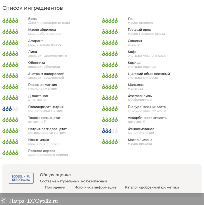 Дистиллированная вода, масло льняное, масло абрикосовое, масло грецкого ореха, масло амарантовое, сквалан, экстракт цветков липы, экстракт черного кофе, экстракт облепихи, экстракт корицы, экстракт водорослей (альгинаты), экстракт цикория, глюконат магния, мальтоза, д-пантенол, фосфолипиды (лецитин), полиакрилат натрия, гиалуроновая кислота, витамин Е, витамин С, дегидроацетат натрия, феноксиэтанол, масло иланг-иланг, масло лимона, масло розового дерева.