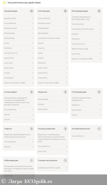 Вода* (Aqua); бутиленгликоль* (ButyleneGlycol); дельта-глюконолактон* (Delta-Gluconolactone); комплекс водорастворимых церамидов и фосфолипидов* (Water, PentyleneGlycol, Phospholipids, Sphingolipids); лизатлактобактерий* (LactobacillusFermentLysate); комплекс аминокислот* (Glycine, Arginine, Lysine, Proline); провитамин В5 (Panthenol); глюкозамин* (Glucosamine HCL); лизатбифидобактерий* (BifidaFermentLysate); натрия РСА* (SodiumPCA); экстракт плода инжира* (FicusCarica (Fig) FruitExtract); глицинат меди (CopperGlycinate); молочная кислота* (LacticAcid); экстракт овса* (AvenaSativa (Oat) KernelExtract); таурин (Taurine); консервант* (SorbitanCaprylate, Propanediol, BenzoicAcid); пропандиол*(Propanediol); хондроитина сульфат* (SodiumChondroitinSulfate); ксантановая камедь* (XanthanGum); зеленый хелатор* (TetrasodiumGlutamateDiacetate); гидроксид натрия* (SodiumHydroxide).