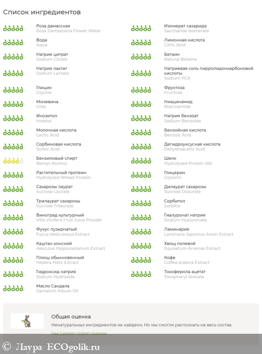 Aqua, Rosa Damascena Flower Water, Saccharide Isomerate (and) Aqua (and) Citric Acid (and) Sodium Citrate*, Natural Betaine, Niacinamide, Sodium Lactate (and) Sodium PCA (and) Glycine (and) Fructose (and) Urea (and) Niacinamide (and) Inositol (and) Sodium Benzoate (and) Lactic Acid, Benzoic Acid (and) Sorbic Acid (and) Dehydroacetic Acid (and) Benzyl Alcohol, Hydrolyzed Protein Silk (протеины шелка), Hydrolyzed Wheat Protein (протеины пшеницы), Glycerin (and) Sucrose Laurate (and) Sucrose Dilaurate (and) Sucrose Trilaurate (and) Sorbitol, Vitis Vinifera (Grape) Fruit Juice Powder (сок винограда), Sodium Hyaluronate, Fucus Vesiculosus (фукуса) Extract, Laminaria Japonica Aresh (ламинарии) Extract, Aesculus Hippocastanum (конского каштана) Extract, Equisetum Arvense (хвоща) Extract, Hedera Helix (плюща) Extract, Coffea arabica (кофе) Extract, Sodium Hydroxide, Tocopheryl Acetate (Витамин Е), Rosa Affinis Rubiginosa Oil (эфирное масло розы), Santalum Album Oil (эфирное масло сандала)