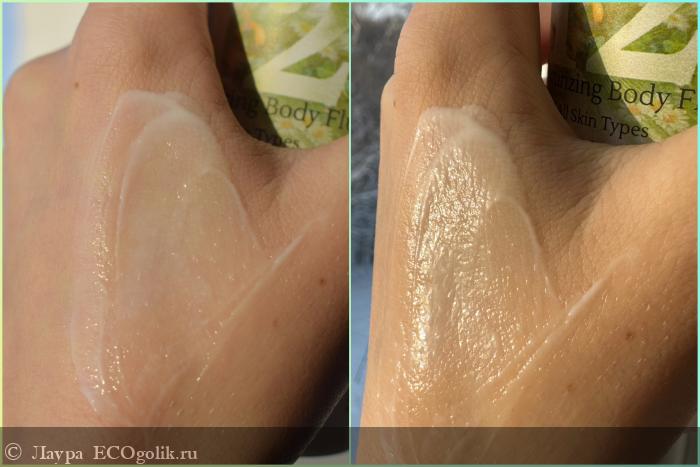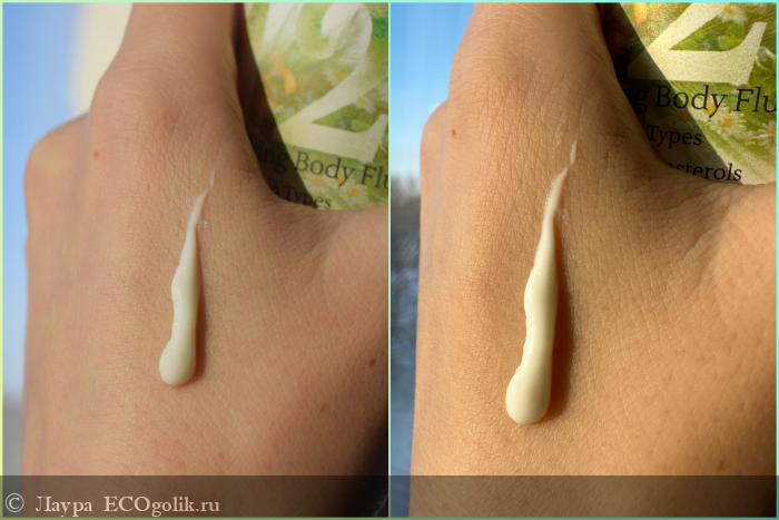 Крем однородной консистенции, без добавок. Мне хватало буквально 5 - 6 нажатий на все тело. Начиная с голени, до шеи и руки я тоже мажу кремом для тела. Бывает даже в течение дня пользовалась.