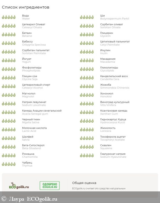Вода, ромашки вода, масло ши, цетеарил оливат, сорбитан оливат, бетаин, глицерин, масло бабассу, цетил пальмитат, сорбитан пальмитат, инулин, порошок йогурта, масло макадамии, фосфолипиды, гликолипиды, фитостеролы соевого масла, воск канделильский, цетеариловый спирт, масло жожоба, магнолол, хонокиол, левулинат натрия, масло виноградных косточек, камедь сенегальской акации, ксантановая камедь, масло черного тмина, масло чаульмугры, молочная кислота, экстракт жимолости, экстракт побегов шалфея, комплекс токоферолов, бета-ситостерол, сквален, экстракт цветов ромашки, гиалуронат натрия, экстракт тимьяна.