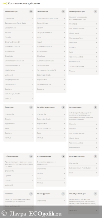 Классно, когда производитель не скрывает и не мудрит с составом. Все написано максимально просто и понятно, где масло там масло, где экстракт там экстракт. А на своем сайте они вообще дают развернутые определения каждого ингредиента, что, зачем и почему.