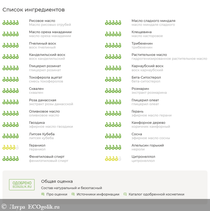 Масло рисовых отрубей, масло миндаля сладкого, масло ореха макадамии, масло касторовое1, воск пчелиный, трибехенин1, воск канделильский, гидрогенизированное растительное масло, глицерил розинат1, воск карнаубский, смесь токоферолов1, бета-ситостерол1, сквален1 (растительный), экстракт розмарина, экстракт розы дамасской, глицерил олеат1, неомыляемая фракция оливкового масла1, эфирное масло герани, эфирное масло гвоздики, эфирное масло листьев коричника камфорного (дерева хо), эфирное масло плодов литсеи кубеба, эфирное масло сосны, гераниол2, нерол2, фенилэтиловый спирт2, цитронеллол2.