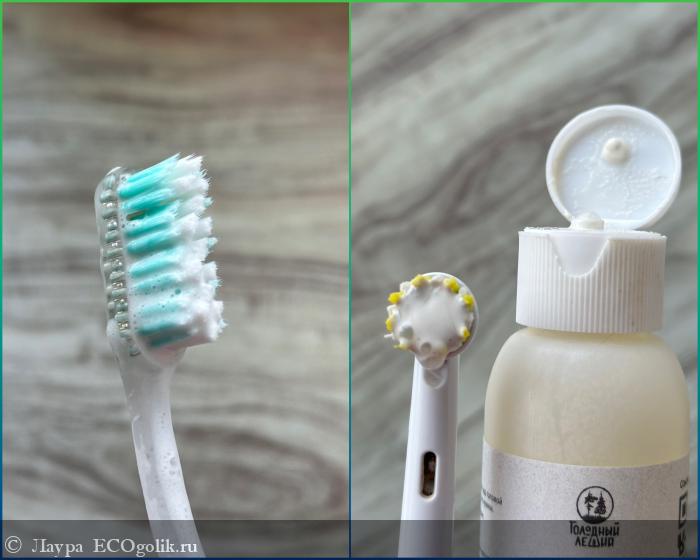 Паста имеет легкий зеленоватый оттенок, навевающий мысли о свежести. Более жидкий формат, чем мы привыкли выдавливать из обычных паст в тюбиках. Однако не убегает, в щетинки щетки не проваливается.