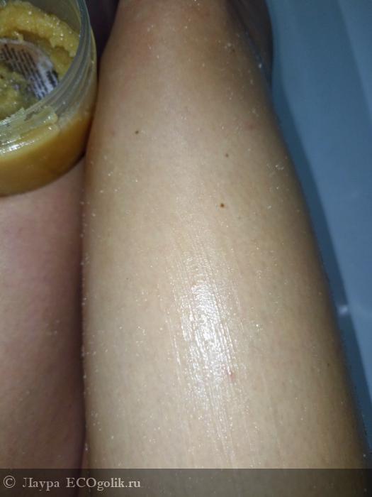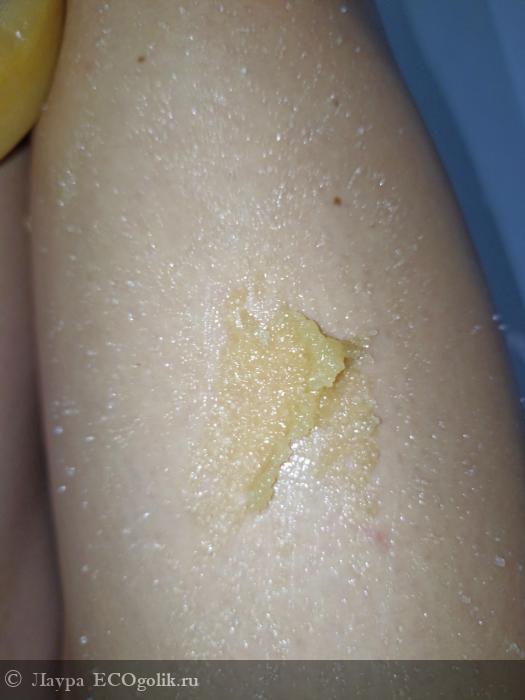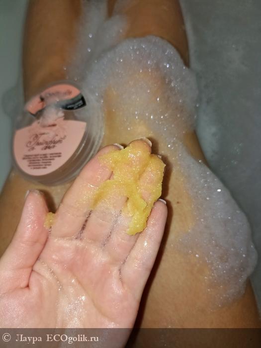 Скраб долгоиграющий, с ним можно и нужно возюкаться долго, делать а-ля массаж и разгонять лимфу. Сахар быстро не тает, а масла в составе обеспечивают хорошее скольжение рукам. Все нужные места скрабятся так, как им положено. Если хочу помягче - добавляю воды чуть чуть, если место 🍑 позволяет скрабить жёстче, то скрабируюсь почти насухую кожу. В общем жесткость можно регулировать.