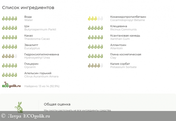 На этикетке: вода, кокамидопропилбетаин, масло ши, касторовое, какао, ксантановая камедь, экстракт эвкалипта, аллантоин, гидроксиэтил мочевина, черная глина, глицерин, бензонат натрия, сорбат калия, эфирное масло нероли.