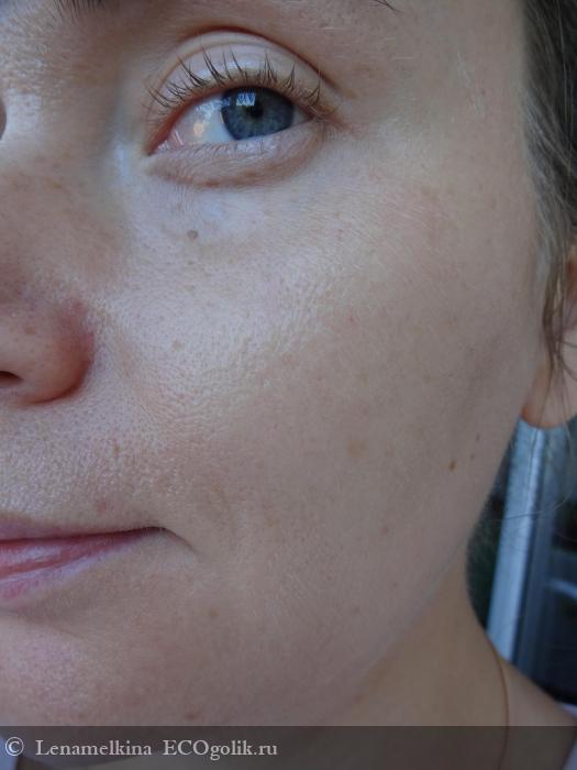 Распределяется ровно, легко, как флюид. Ложится на лицо равномерно