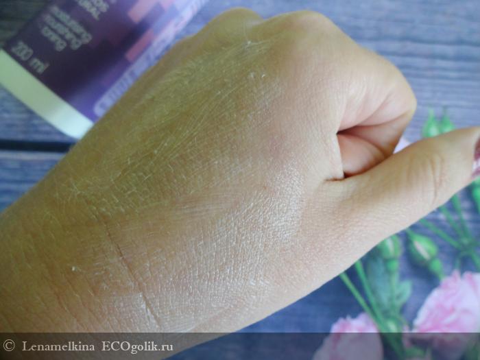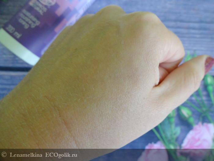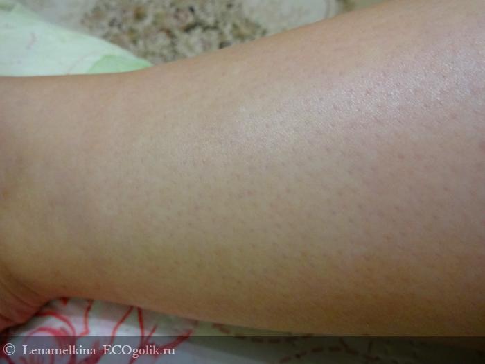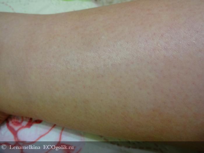 Наносим молочко. Оно отлично разносится по телу, словно скользит. Через 2 минуты молочко впиталось. Верхний слой кожи стал увлажнённым, практически исчезло раздражение. За счёт того, что клетки кожи получили увлажнение и питание, они стали более плотно прилегать друг к другу. Поэтому внешний вид тела становится более гладким и "сияющим".