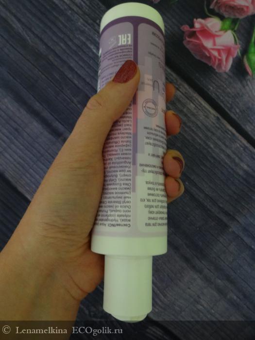 Удлинённый пластиковый флакон удобно держать в руке. Дизайн в лавандовых оттенках. На этикетке есть описание средства, его состав, условия и сроки хранения, и информация о производителе.