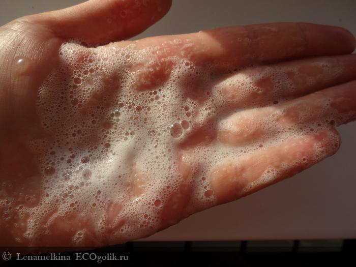 Гель следует наносить на влажное лицо, предварительно вспенив в мокрых ладонях. Обычно другие средства для умывания я наношу сразу на влажное лицо и размыливанию уже на лице. Но этот гель так не пенится. Нужно выдавить порцию геля на мокрую ладонь, слегка смочить водой пальцы другой руки и вспенить на ладони. Потом эту пенку нанести на влажное лицо и распределить.