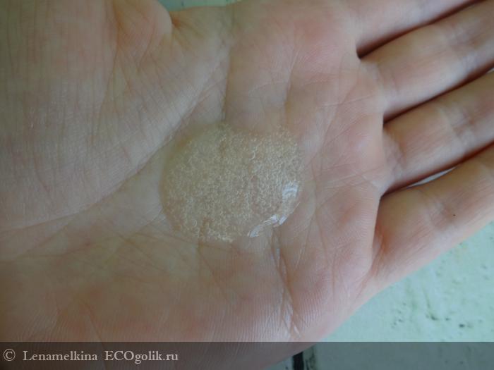 Гель имеет отличную среднюю по густоте консистенцию. Он не жидкий как вода, и не сбитый как желе. Есть пузырьки воздуха в консистенции. Цвет почти прозрачный.