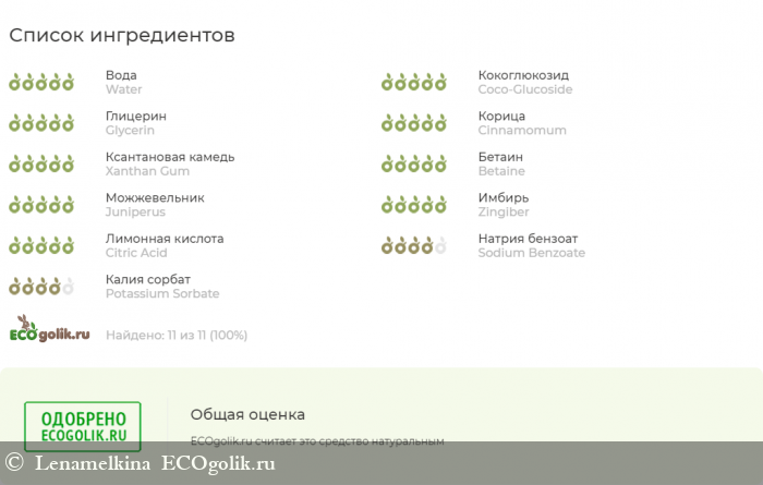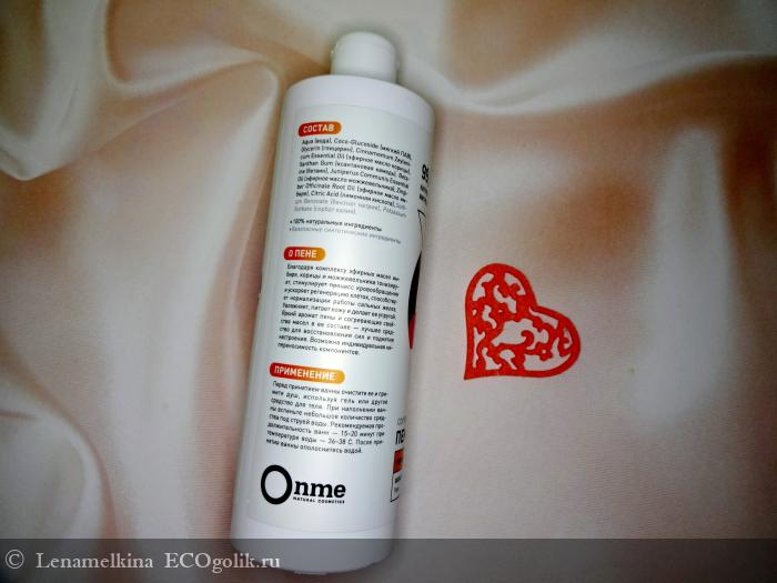 Как и все продукты Onme, пена для ванны состоит из натуральных, а также безопасных синтетических ингредиентов. Содержание последних крайне маленькое, всего 0,2% - и это консерванты. Безопасность состава одобрена специальным сервисом на портале.