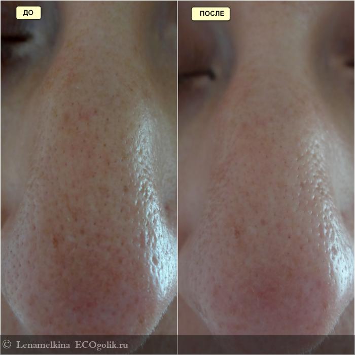 Результат работы маски до и после. Маска даёт прекрасный видимый эффект даже с первого раза. Она отлично чистит поры и мягко сглаживает микрорельеф кожи.