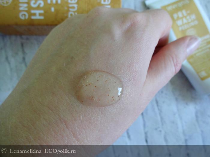 Пилинг-скраб имеет консистенцию геля. Он полупрозрачный, немного с желтоватым оттенком. Отчетливо можно разглядеть мелкие коричневые точки-вкрапления. Думаю, что это и есть перемолотая кедровая скорлупа.