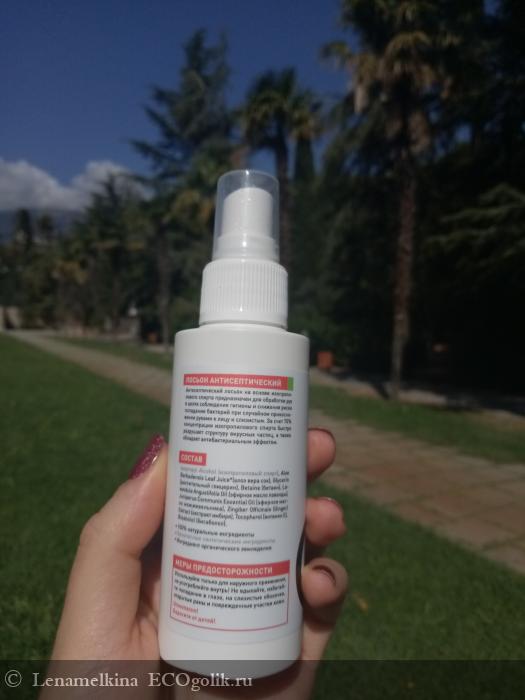 - Эффективность. Производитель утверждает, что за счёт высокой концентрации спирта, а также наличия эфирных масел лосьон быстро разрушает структуру вирусных частиц, а также обладает антибактериальным эффектом. Здесь мне остаётся только верить, потому что проверить это можно только лабораторно. Согласно исследованиям, изопропиловый спирт убивает 99,9% всех не спорообразующих бактерий на коже человека в течение 30 секунд. По крайней мере, во время отдыха в Крыму никакая зараза к нам не пристала