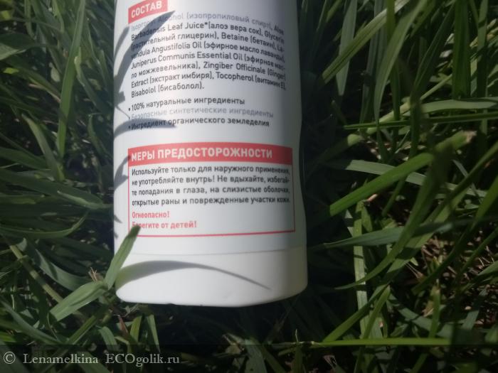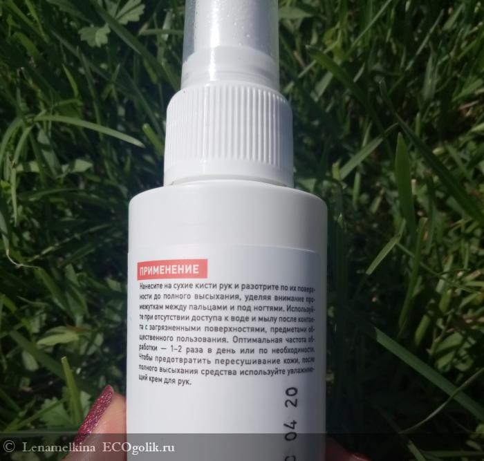 - Запах. Сразу после распыления ощущается сильный спиртовой дух. Но он быстро улетучивается с рук, буквально за несколько секунд. Дальше в запахе слышны эфирные масла. Я ощущаю приглушённую лаванду. В целом, аромат антисептика довольно сносный, отвращения не вызвал (да, мне попадались такие, от которых просто воротило