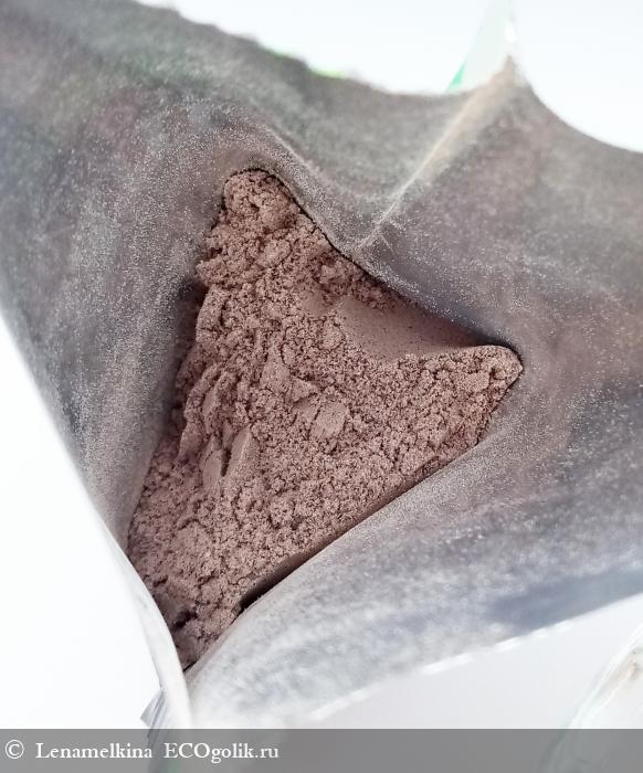 Внутри пакета однородная порошковая масса светло-коричневого цвета и отчетливым запахом шоколада. Похоже на детский горячий шоколад)