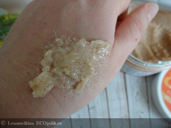 Вообще, я ждала, что скраб будет иметь разогревающий эффект. Название "Мёд и имбирь" наводит на это ожидание. Ничего подобного я не ощутила, хотя в составе присутствуют и мёд, и экстракт имбиря. Лишь только лёгкое покалывание от соли на участках с чувствительной кожей. Но поскольку в целом скраб мне так понравился, что это обстоятельство ничуть не огорчило.