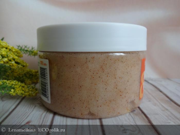 Сквозь прозрачный пластик банки можно увидеть консистенцию и цвет скраба. Уже сразу меня порадовало, что скраб однородный и не расслаивается.