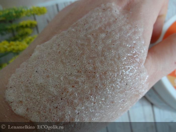 Понравилось то, что скраб хоть и густой, но при этом прекрасно сцепляется с влажной кожей и не осыпается в процессе. А вот набирать скраб из банки лучше сухими руками, чтобы избежать лишнего попадания влаги в банку и избежать его преждевременного таяния. При соприкосновении с водой скраб белеет и кажется, что он эмульгирует. Во всяком случае визуально процесс становится похожим на образование молочка